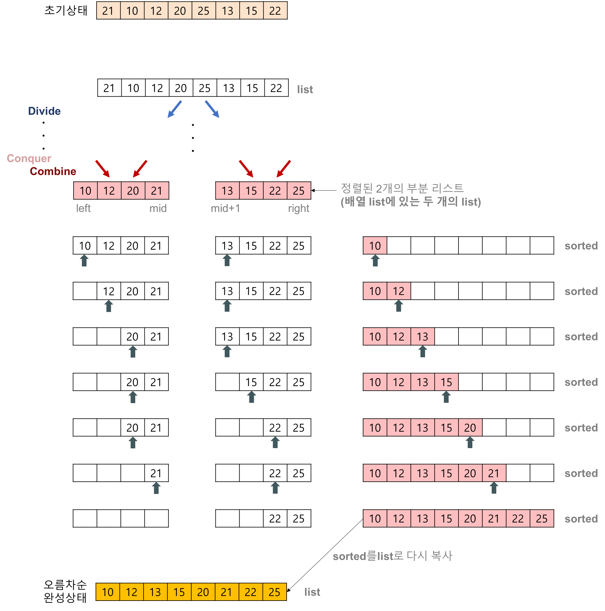 아래 그림은 정렬된 두 리스트({10,12,20,21}, {13,15,22,25})를 병합하여 하나의 정렬된 리스트를 만드는 과정을 나타낸다. 정렬된 2개의 리스트를 병합하는데는 $O(n)$의 복잡도로 처리가 가능하다는 것이 중요하다.