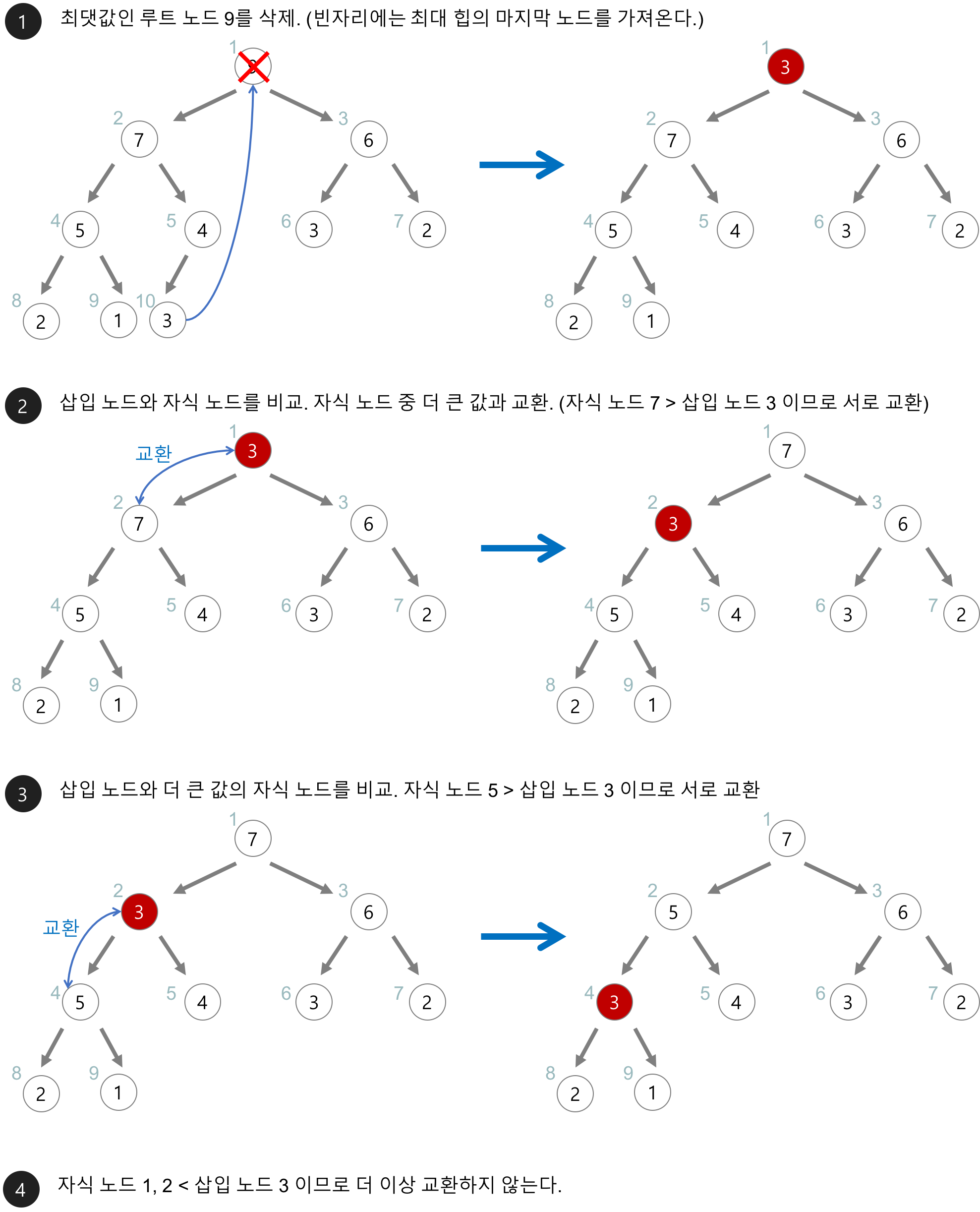 최대 힙(max heap)에서 삭제 연산은 최댓값을 가진 노드를 삭제하는 것이다. 최댓값을 가진 노드는 루트 노드이므로 루트 노드가 삭제한다. 그리고는 힙의 규칙에 맞게 노드들을 재구성한다.