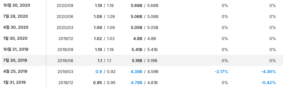 매출은 5B 전후로 나오고 주당순이익은 조금씩 성장하는 느낌(?) 입니다 ㅎㅎ